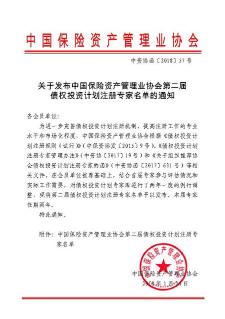 本所合伙人田社国律师成功入选“中国保险资产管理业协会第二届债权投资计划注册专家”