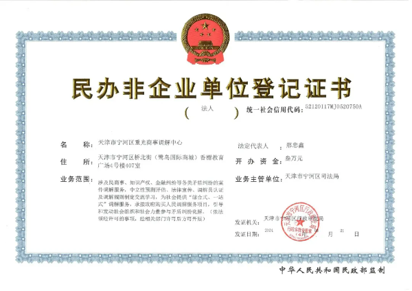 2024年8月21日,为全面贯彻落实中央全面深化改革委员会《关于加强诉源治理推动矛盾纠纷源头化解的意见》等系列文件要求,坚持和发展新时代“枫桥经验”,不断强化一站式多元解纷机制建设,北京重光(天津)律师事务所发起的“天津市宁河区重光商事调解中心”(以下简称“重光商事调解中心”)正式成立。